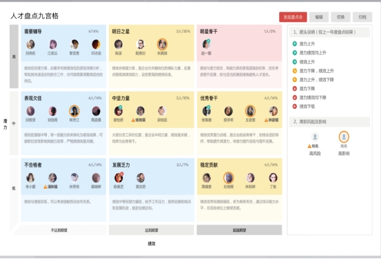 利用在线九宫格快速定位人才,做好人才盘点,快速识别企业人才的质量与数量, 让人才布局更 “合理”;同时满足快速招人,精准选人,人岗速配,让优秀的人才浮出水面。
