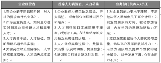 在企业经营过程中,因每个人扮演的角色不同,遂关注人才的重心与方向就会有所不同,我们来看看企业中的总经理、人力资源负责人、业务经理/员工他们是如何看待人才发展过程中挑战与问题: