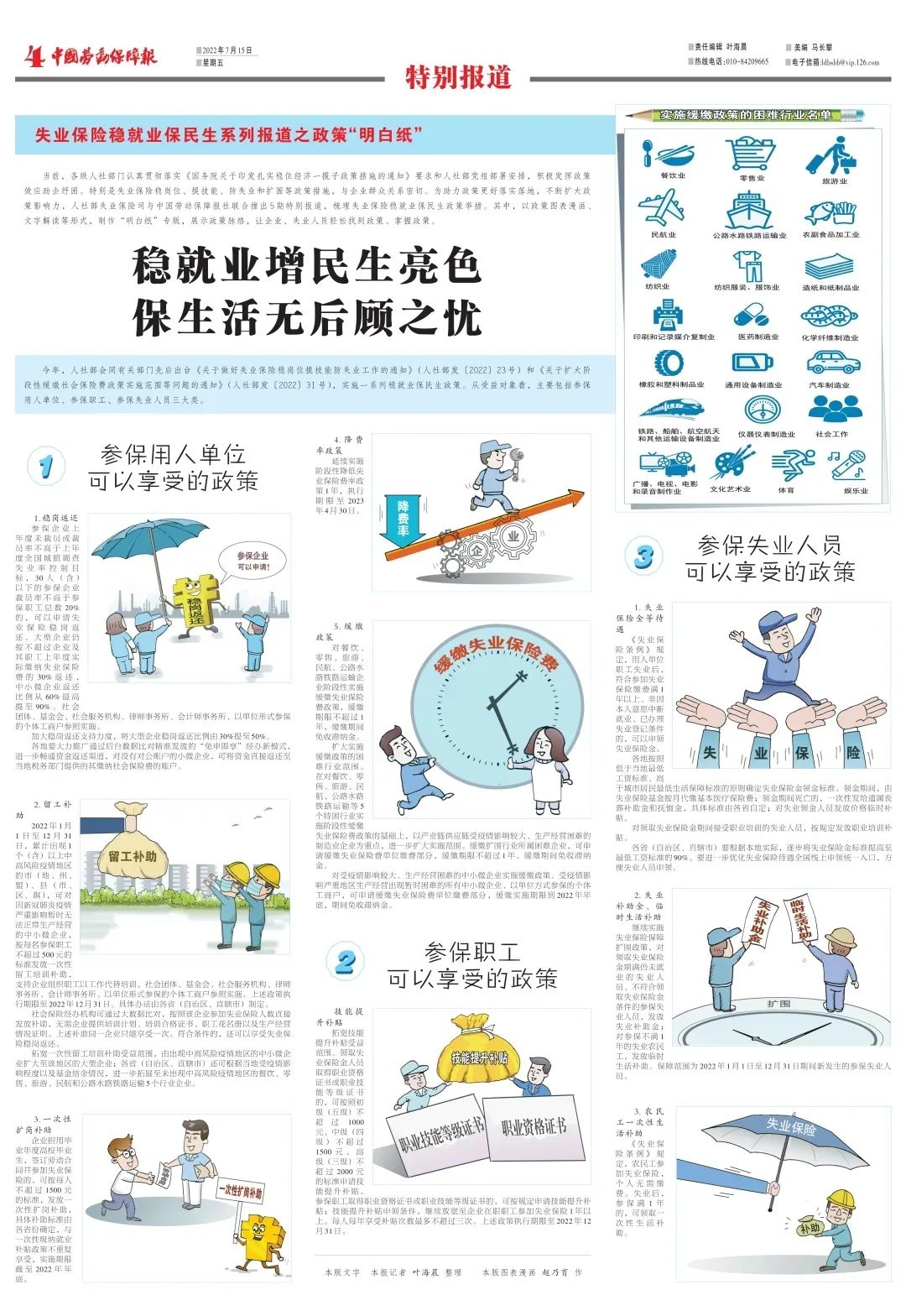 当前,各级人社部门认真贯彻落实《国务院关于印发扎实稳住经济一揽子政策措施的通知》要求和人社部党组部署安排,积极发挥政策效应助企纾困。特别是失业保险稳岗位、提技能、防失业和扩围等政策措施,与企业群众关系密切。为助力政策更好落实落地,不断扩大政策影响力,人社部失业保险司与中国劳动保障报社联合推出5期特别报道,梳理失业保险稳就业保民生政策举措。其中,以政策图表漫画、文字解读等形式,制作“明白纸”专版,展示政策脉络,让企业、失业人员轻松找到政策、掌握政策。